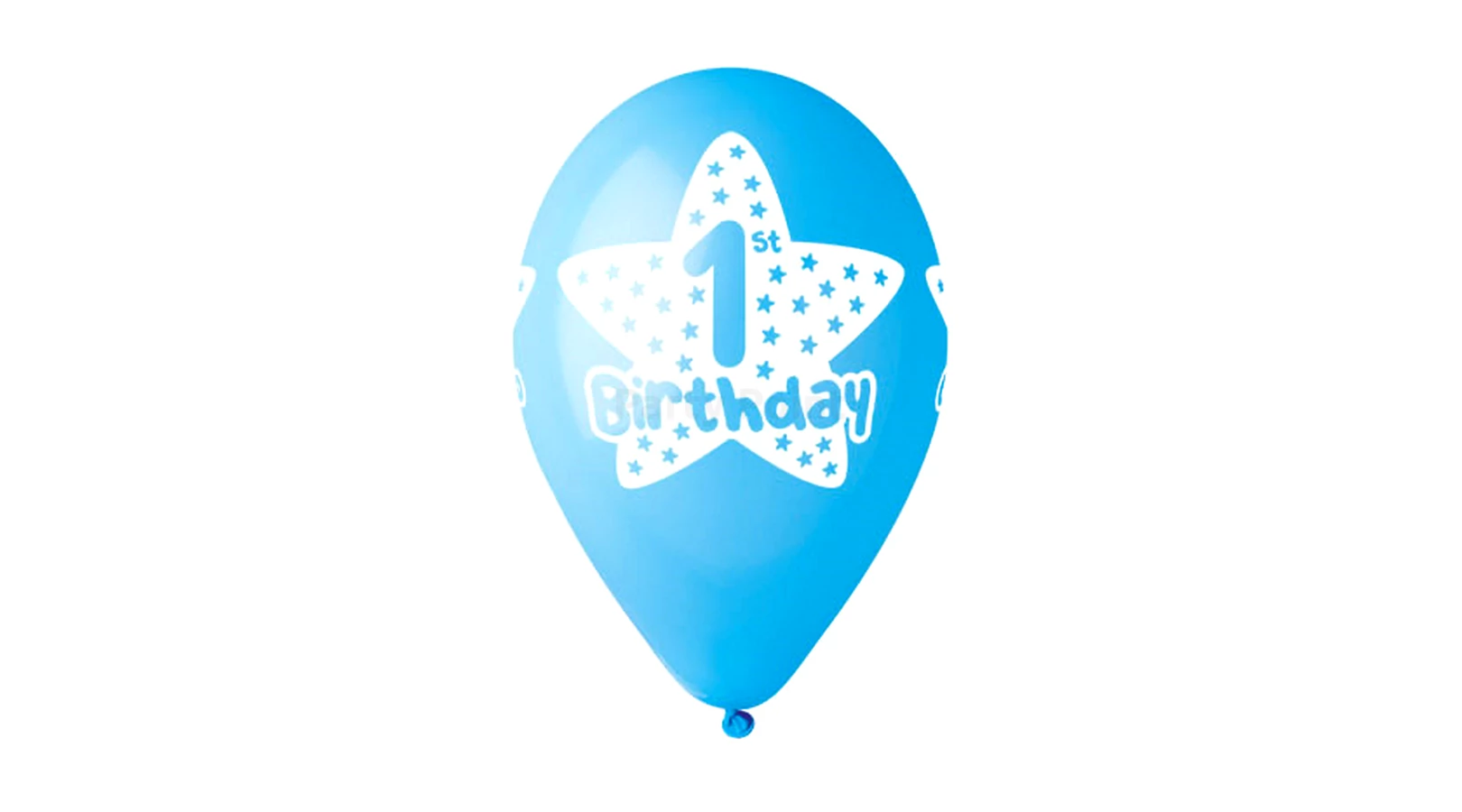 30 cm-es első születésnapra kék printelt lufi 10 db/cs. Az első születésnap igazán különleges alkalom! Dobd fel a party dekorációt ezzel a vidám, kék, printelt gumi lufival. Kiegészítésként választhatsz mellé számozott zászlókat vagy alkalomhoz illő feliratot. Héliummal és levegővel is tölthető.