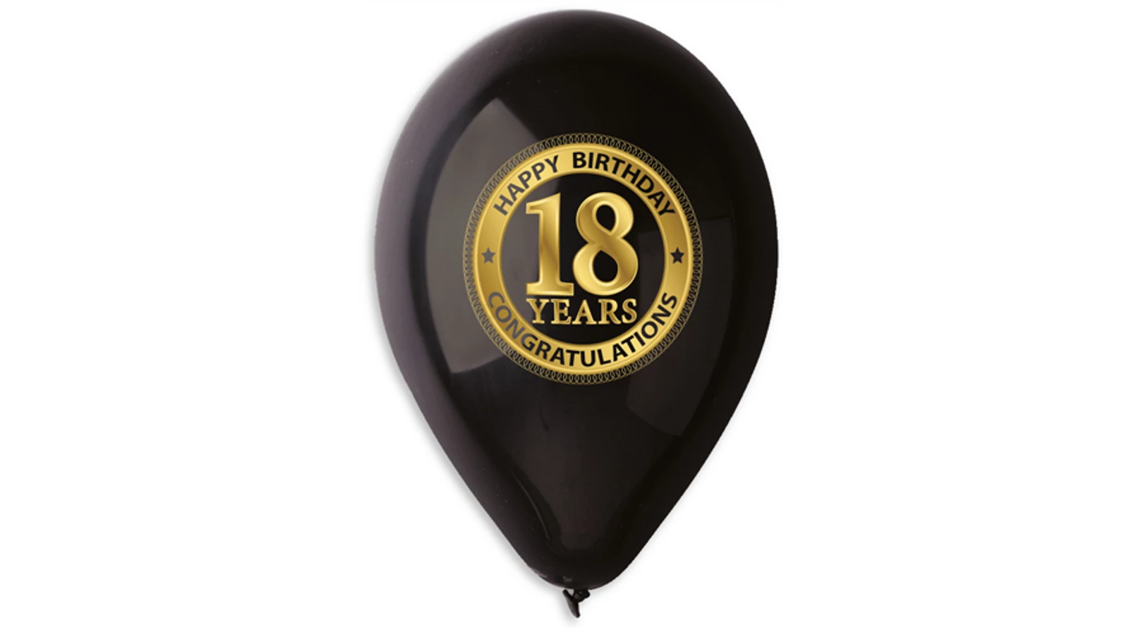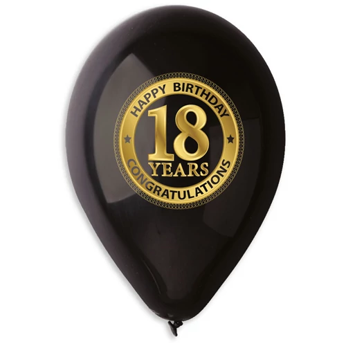 30 cm-es fekete 18. születésnapra fehér gumi lufi 10 db/cs. A 18. születésnap igazán különleges alkalom! Dobd fel a party dekorációt ezzel a különleges, arannyal nyomott gumi lufival. Kiegészítésként választhatsz mellé számozott zászlókat vagy alkalomhoz illő feliratot. Héliummal és levegővel is tölthető.