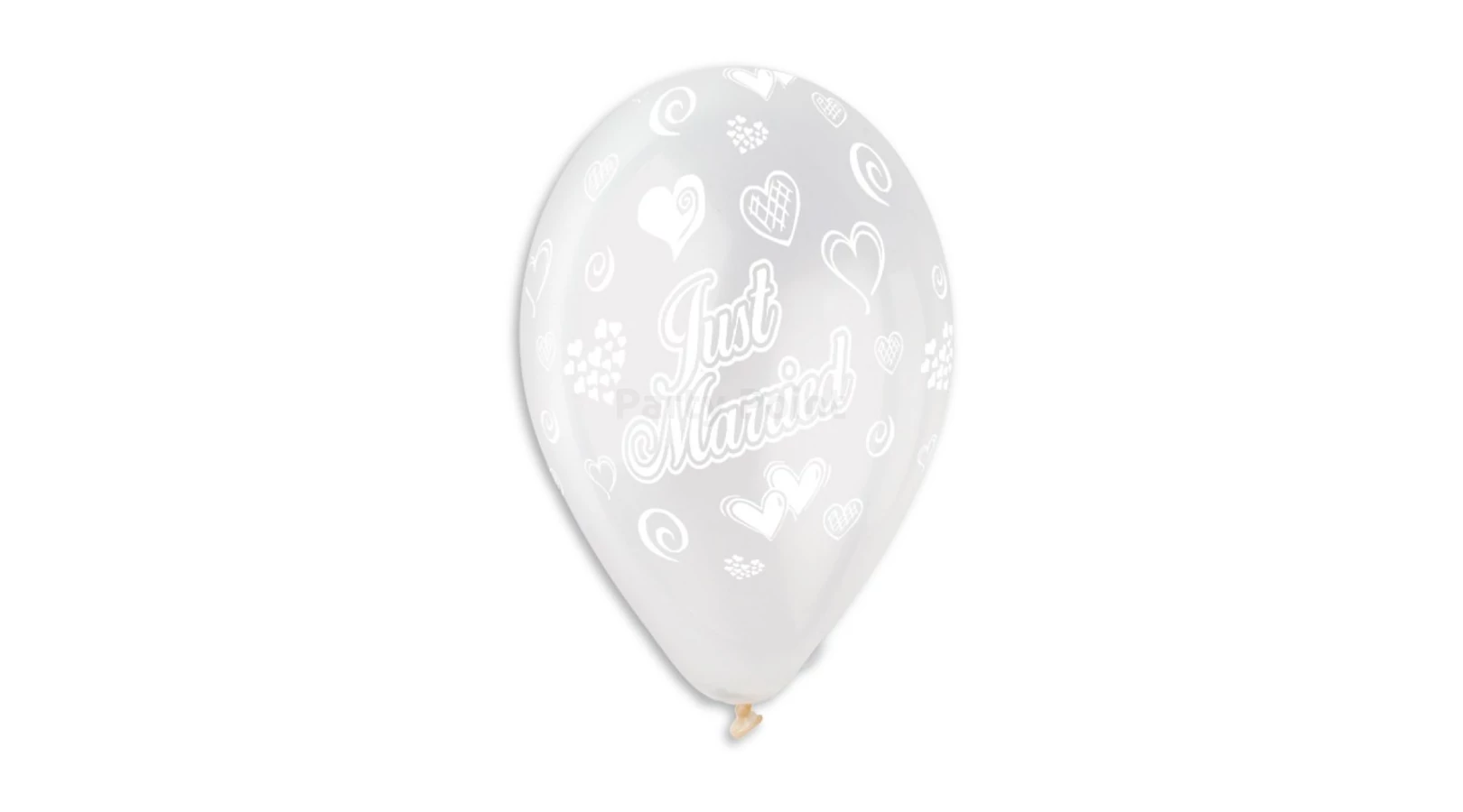 30 cm-es Just Married szives átlátszó printelt léggömb, 10 db. Tedd hangulatossá az esküvői dekorációt ezzel az alkalomhoz illő, átlátszó, printelt gumi lufival. Válassz mellé más egyszínű vagy printelt lufikat kiegészítésként! Héliummal és levegővel is tölthető.