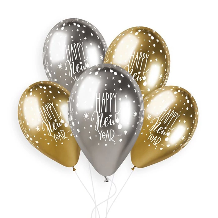 33 cm-es Happy New Year arany - ezüst Shiny gumi léggömb - 25 db / csomag