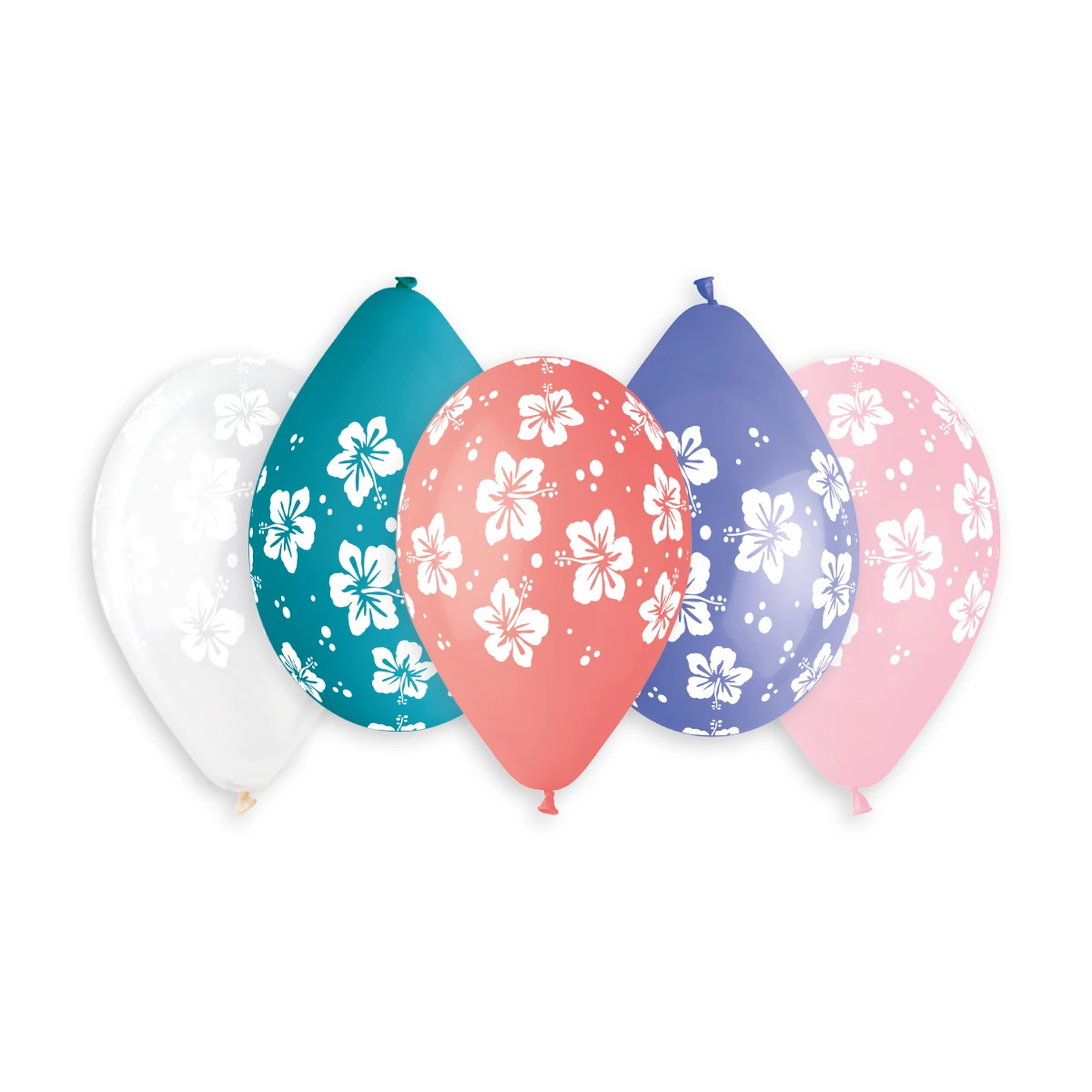 33 cm-es fehér hibiszkusz printelt gumi léggömb - 10 db / csomag