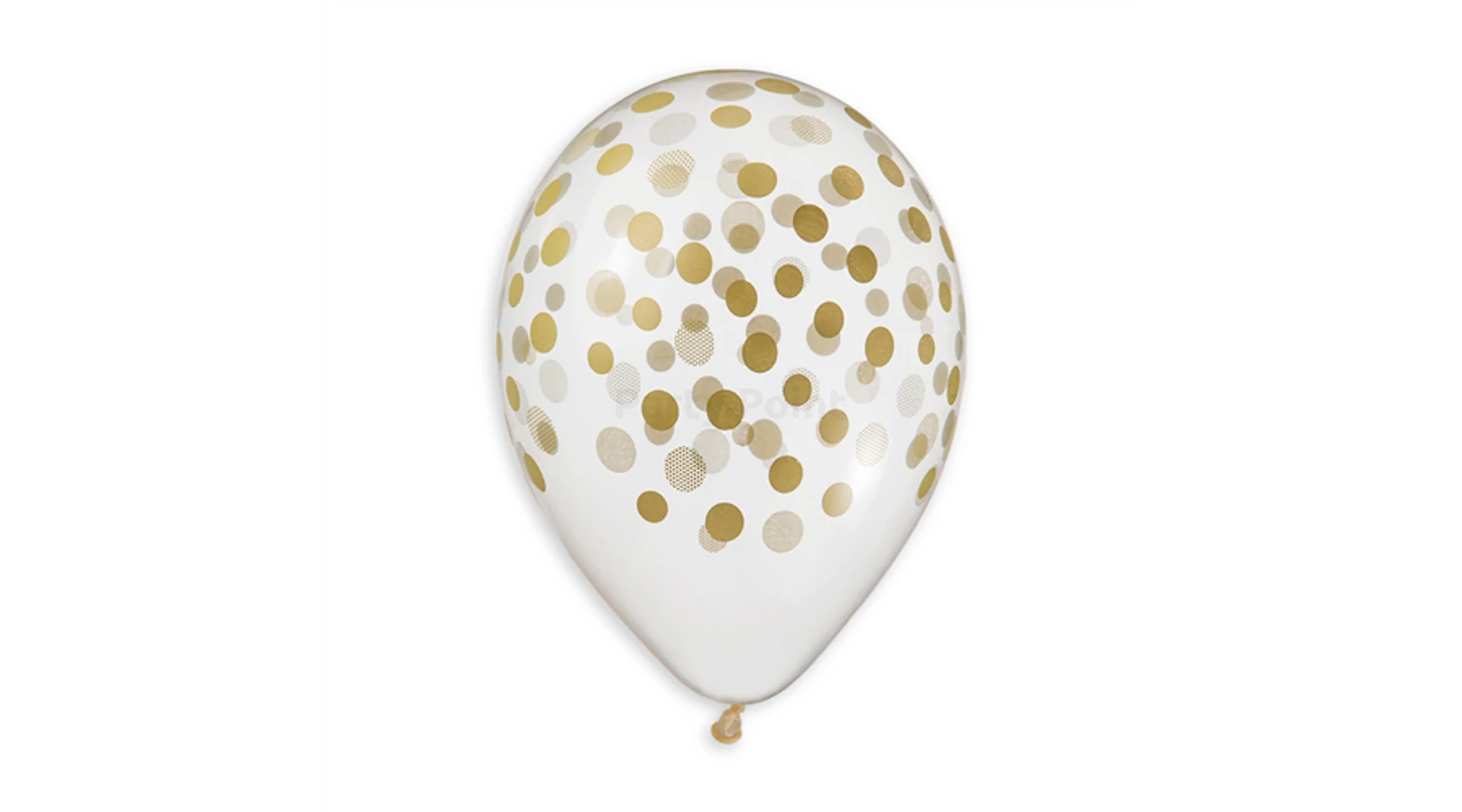 Ez az elegáns, arany konfettis léggömbbel bármilyen dekorációt feldobhatsz, legyen szó születésnapi partyról, ballagásról, szilveszterről, vagy akár esküvőről. Kiegészíthető más printelt, vagy egyszínű léggömbökkel. Héliummal és levegővel is tölthető.
