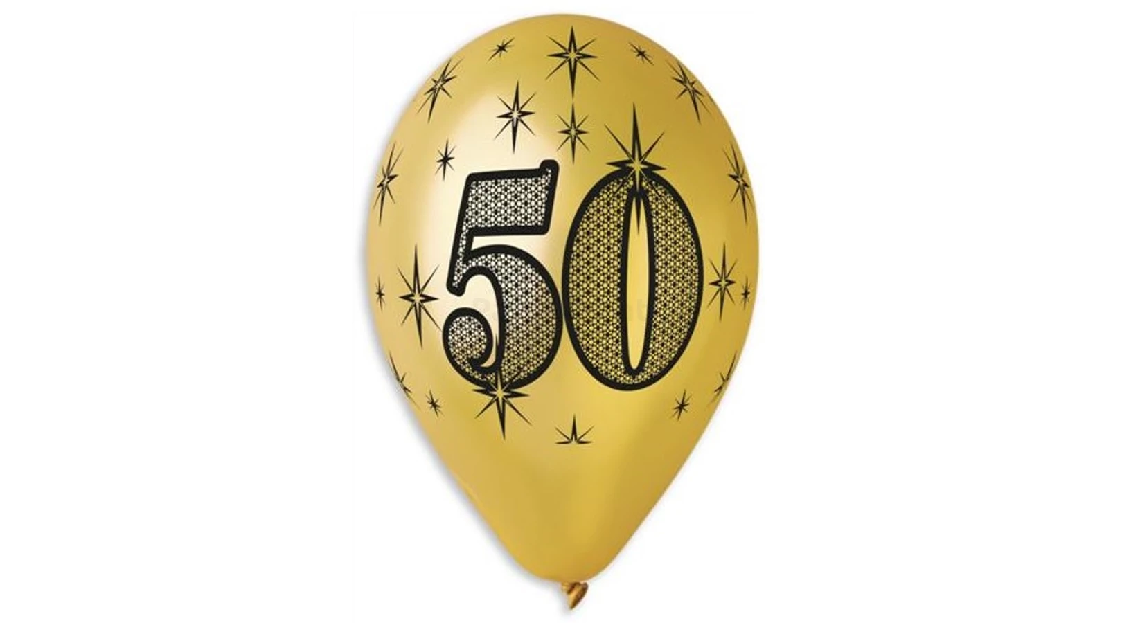 33 cm-es metál arany színű 50-es szám printelt gumi léggömb - 100 db / csomag