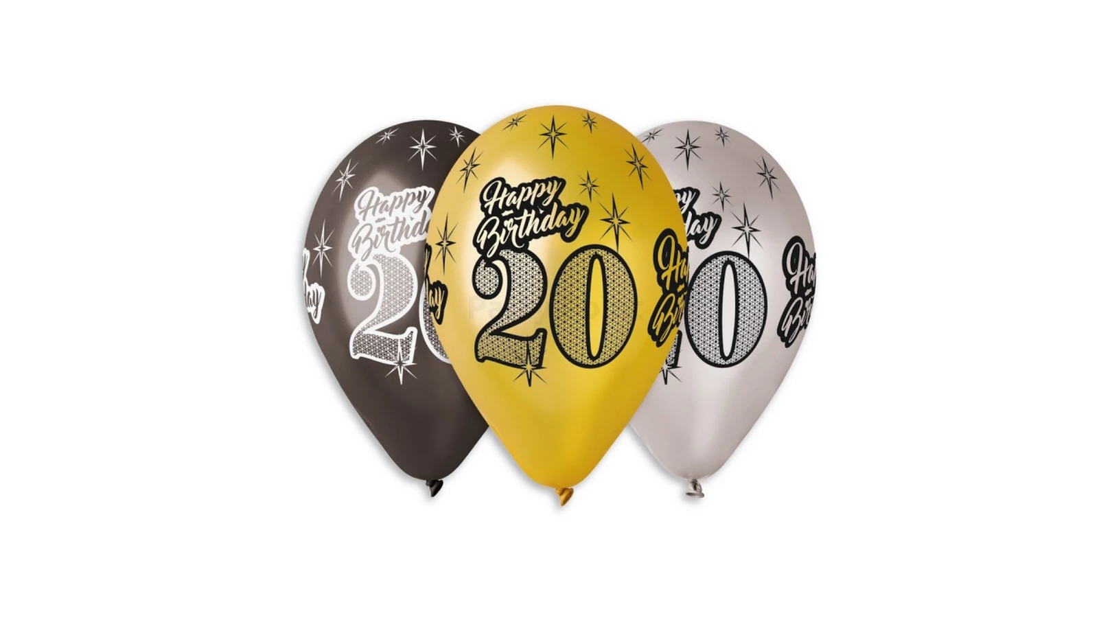 33 cm-es metál, csillagos HB 20. születésnapra printelt gumi léggömb 3 színben - 10 db / csomag