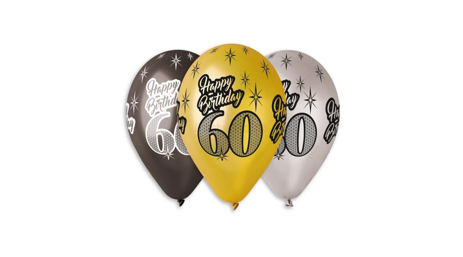 33 cm-es metál, csillagos HB 60. születésnapra printelt gumi léggömb 3 színben 50 db/cs.