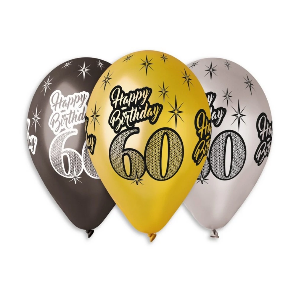 33 cm-es metál, csillagos HB 60. születésnapra printelt gumi léggömb 3 színben - 50 db / csomag