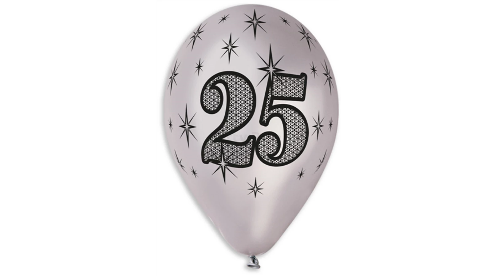 33 cm-es metál ezüst színű színű, csillagos gumi léggömb 25. évfordulóra vagy születésnapra.
