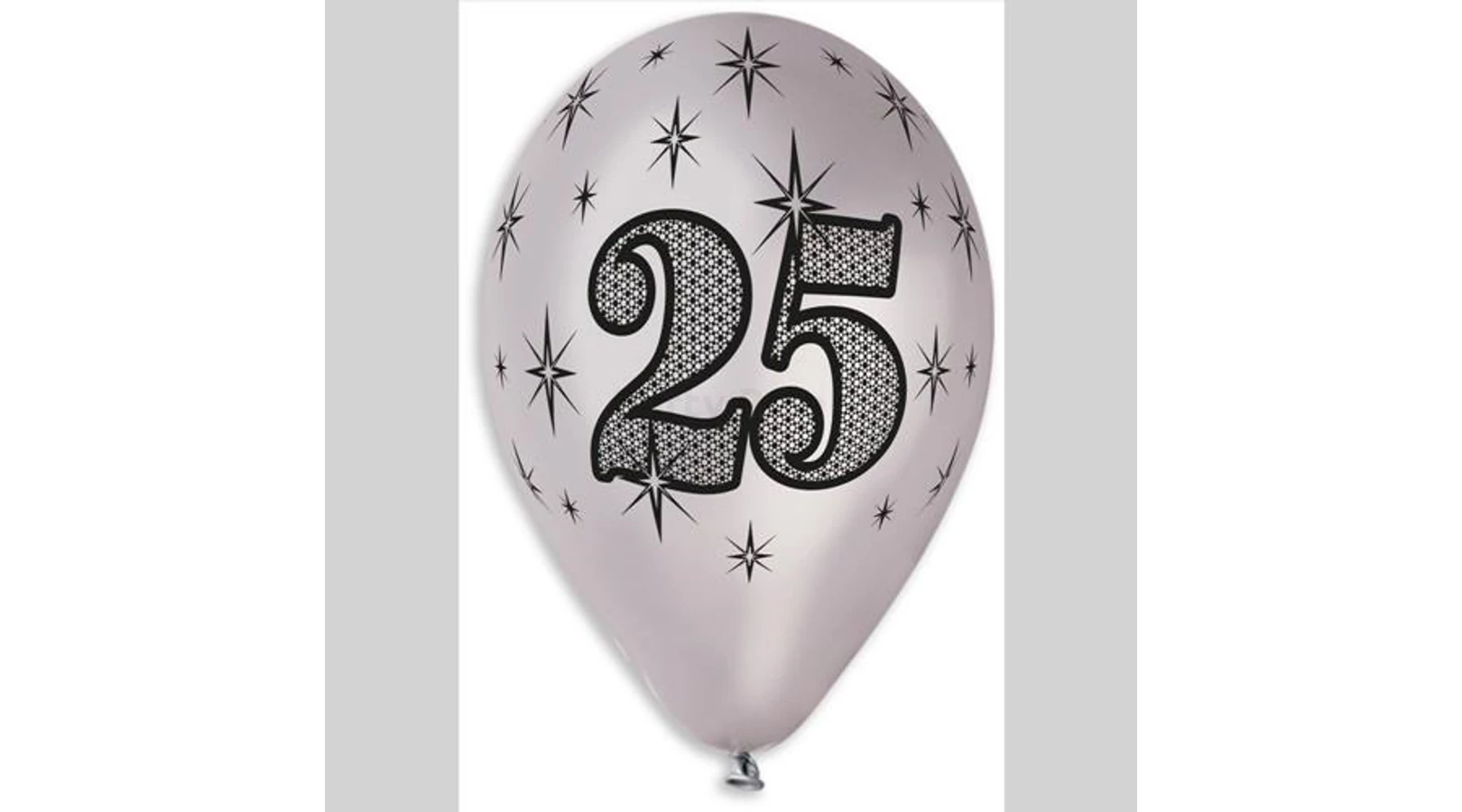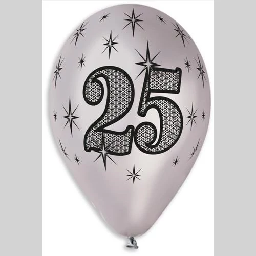 33 cm-es metál ezüst színű színű, csillagos gumi léggömb 25. évfordulóra - 100 db / csomag