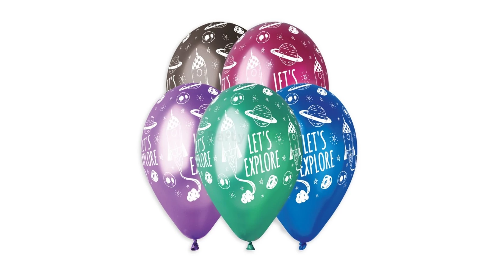 33 cm-es metál Let's Explore! feliratú, űrhajós printelt gumi léggömb vegyes színekkel, 10 db/csomag.