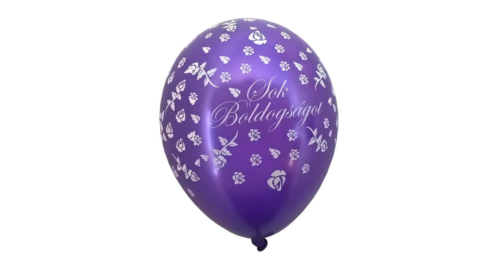 33 cm-es Sok Boldogságot prl sötét lila printelt gumi lufi 20db/cs. Esküvőre, eljegyzési bulira ajnáljuk dekorációként, ezt a sötétlila, "Sok Boldogságot" feliratú gumi lufit. Kiegészíthető más egyszínű vagy alkalomhoz illő, printelt léggömbökkel. Héliummal és levegővel is tölthető.