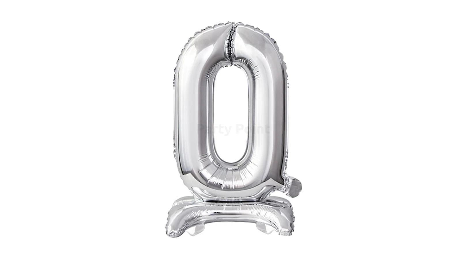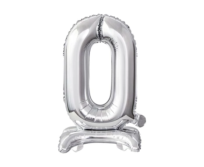 38 cm-es talpon álló ezüst színű 0-ás szám fólia lufi. A lufi levegővel tölthető, önzáró szelepes.