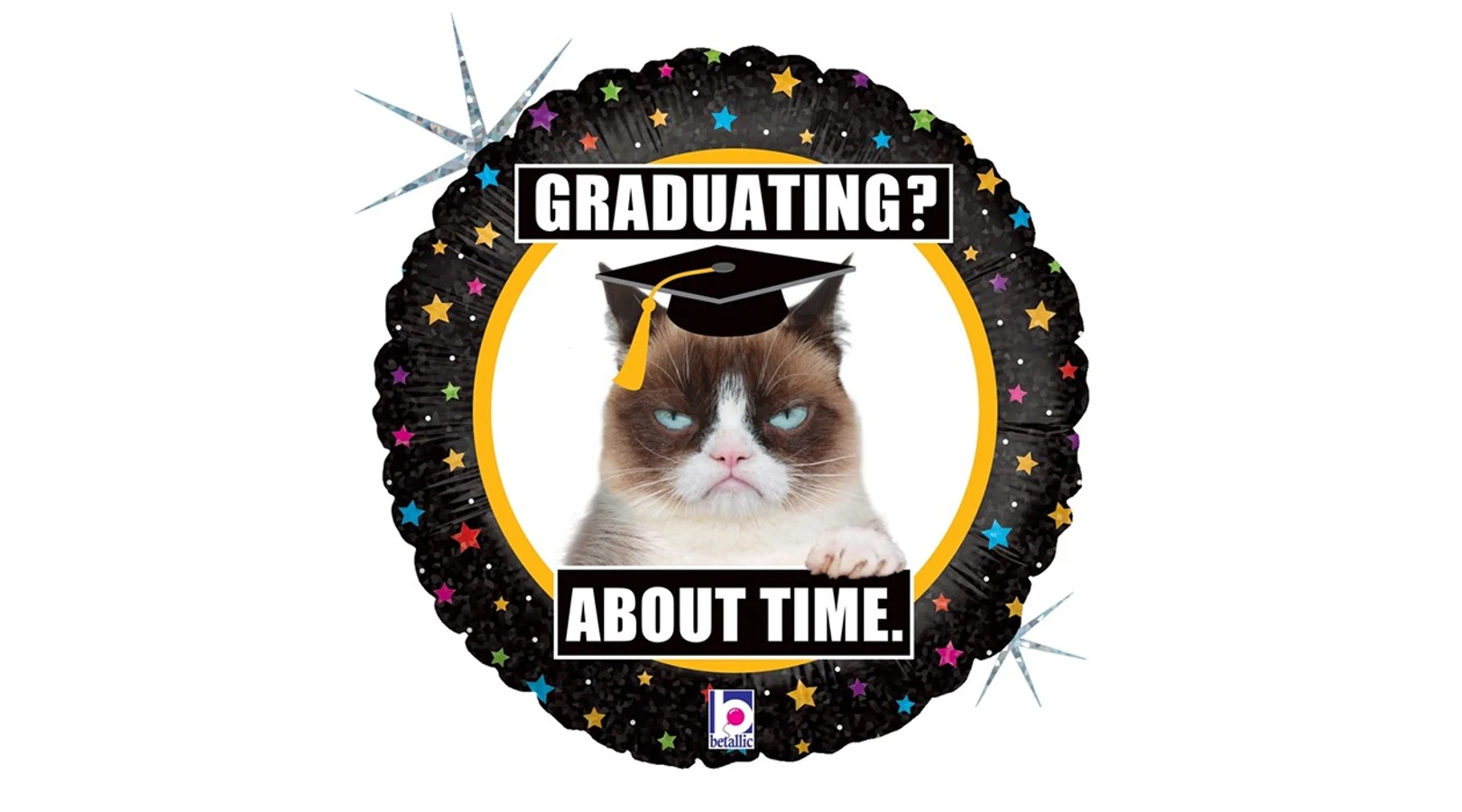 45 cm-es Grumpy cat ballagós kalapban Graduating? fólia lufi Ballagásra, diplomaosztóra szuper ajándék ez a vicces Grumpy cates, Graduating? About time feliratos fólia lufi. Levegővel és héliummal is fújható. Mérete: 45 cm.