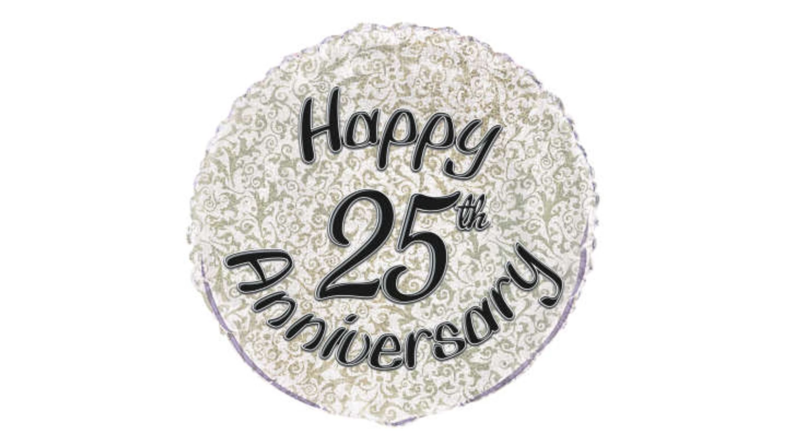 45 cm-es ezüst Happy 25. Anniversary fólia lufi