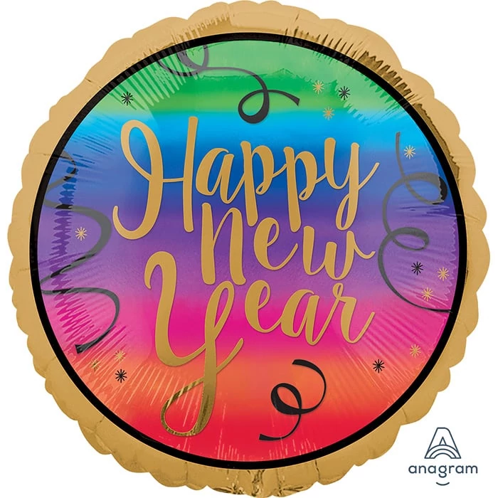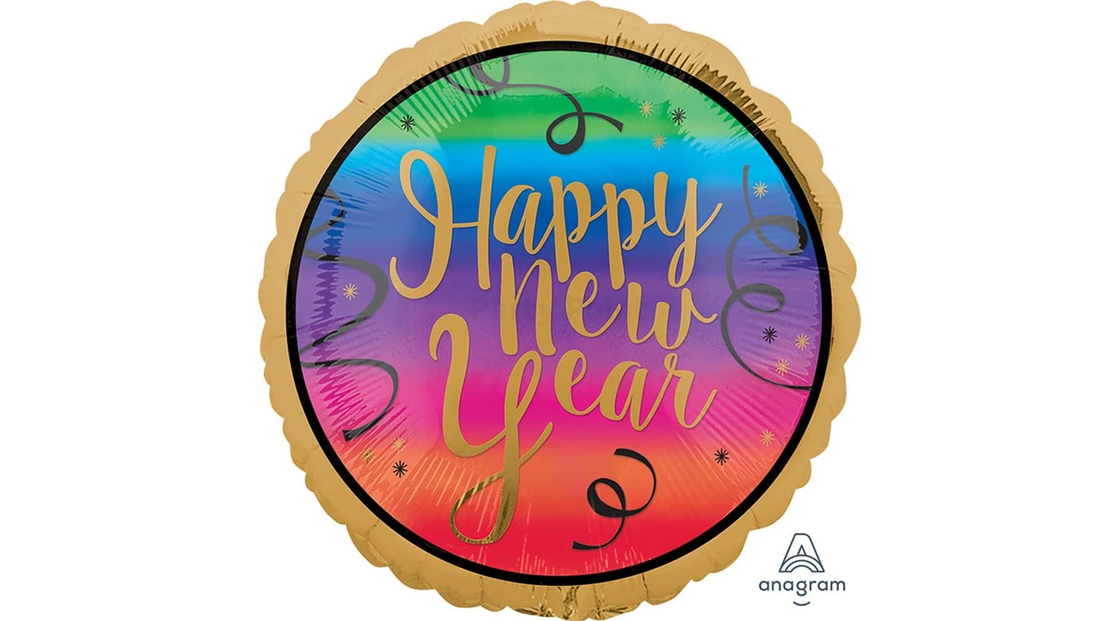 45cm-es Happy New Year fólia lufi. Dobd fel a szilveszteri party dekorációt ezzel a vidám, színes, feliratos fólia léggömbbel. Kiegészítheted szilveszteri feliratokkal és konfettivel is. Önzáró szeleppel rendelkezik; héliummal és levegővel is tölthető.
