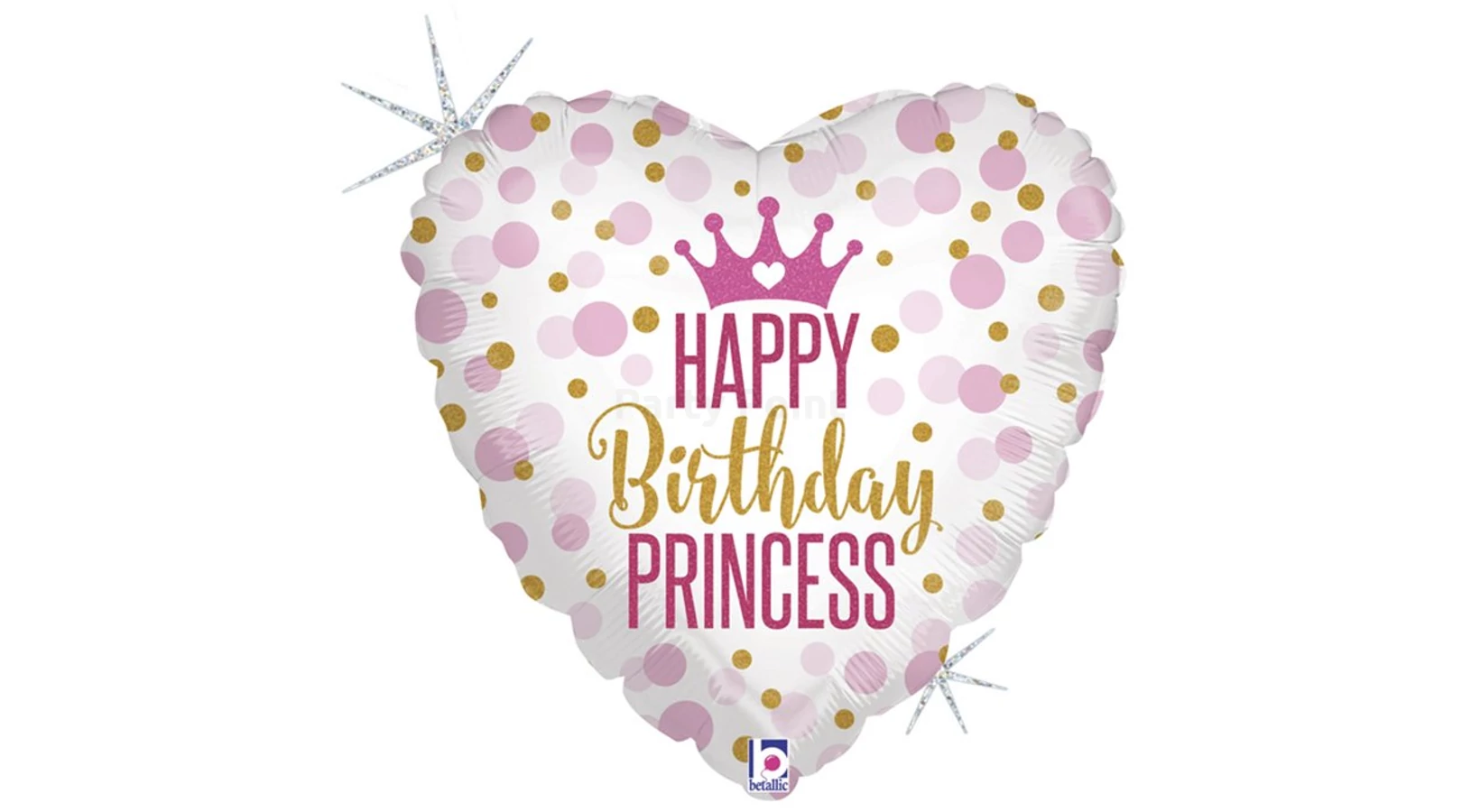 45 cm-es hologramos Happy Birthday Princess szív alakú fólia lufi. Ez a szív alakú fólia lufi Happy Birthday Princess felirattal remek választás egy születésnapi party dekorációjához, de ajándéknak is szuper. Mérete: 45 cm. Héliummal és levegővel is tölthető, önzáró szeleppel rendelkezik.