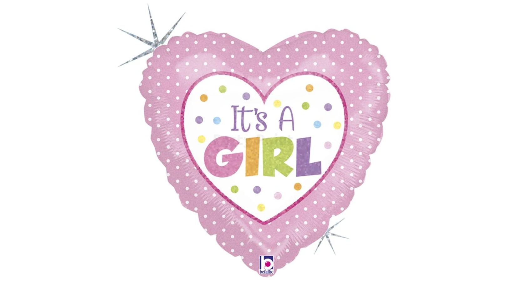 45 cm-es hologramos It's A Girl pink pöttyös szív alakú fólia lufi. Babaváróra tökéletes dekoráció vagy akár ajándék is lehet ez az "It's A Girl" feliratos fólia lufi. Kombinálhatod fehér, ezüst vagy halvány rózsaszín lufikkal is. Héliummal és levegővel tölthető, önzáró szeleppel rendelkezik. Mérete: 45 cm.