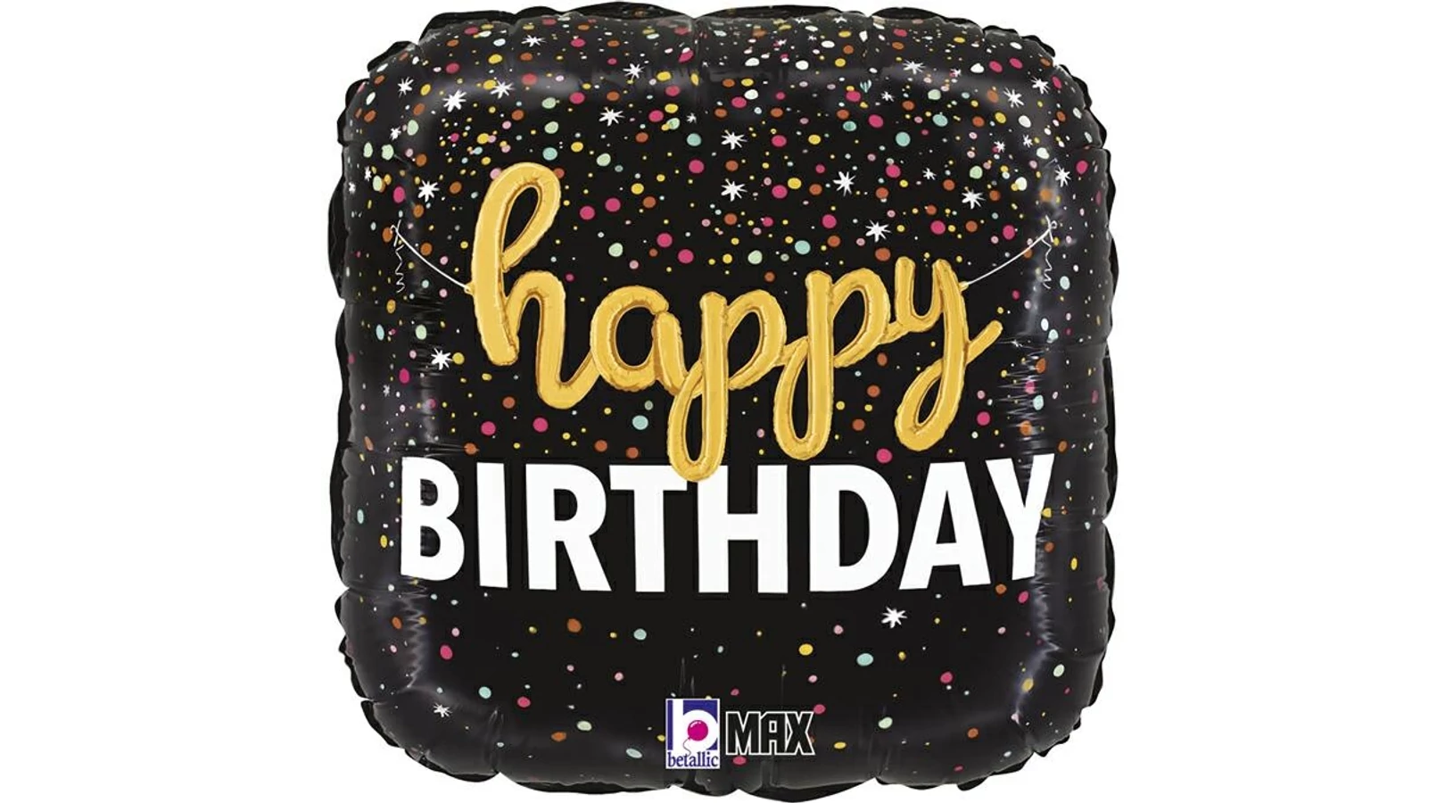 46 cm-es kocka alakú fekete Happy Birthday konfettis fólia lufi
