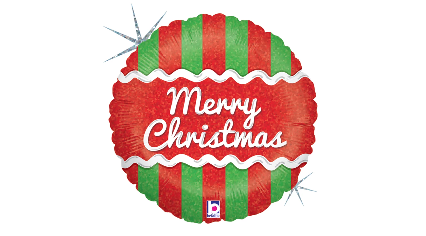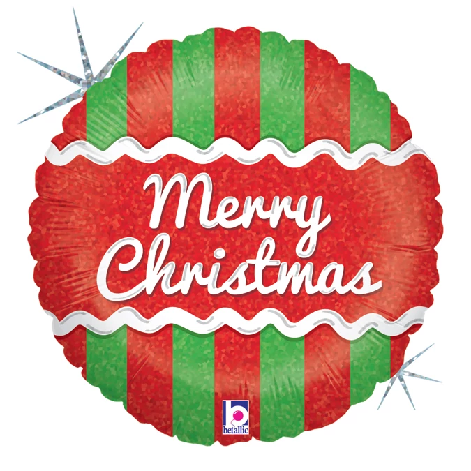 46 cm-es Merry Christmas feliratú, csíkos mintájú, hologrammos fólia lufi