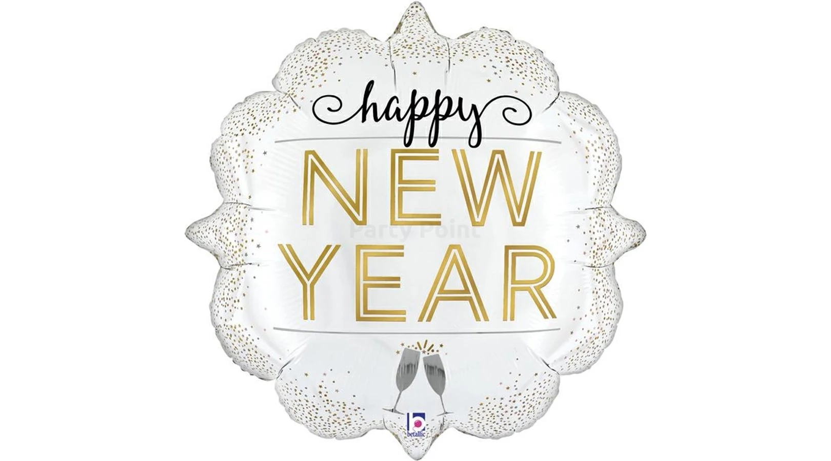 61 cm-es pezsgőspoharas Happy New Year kocka fólia lufi