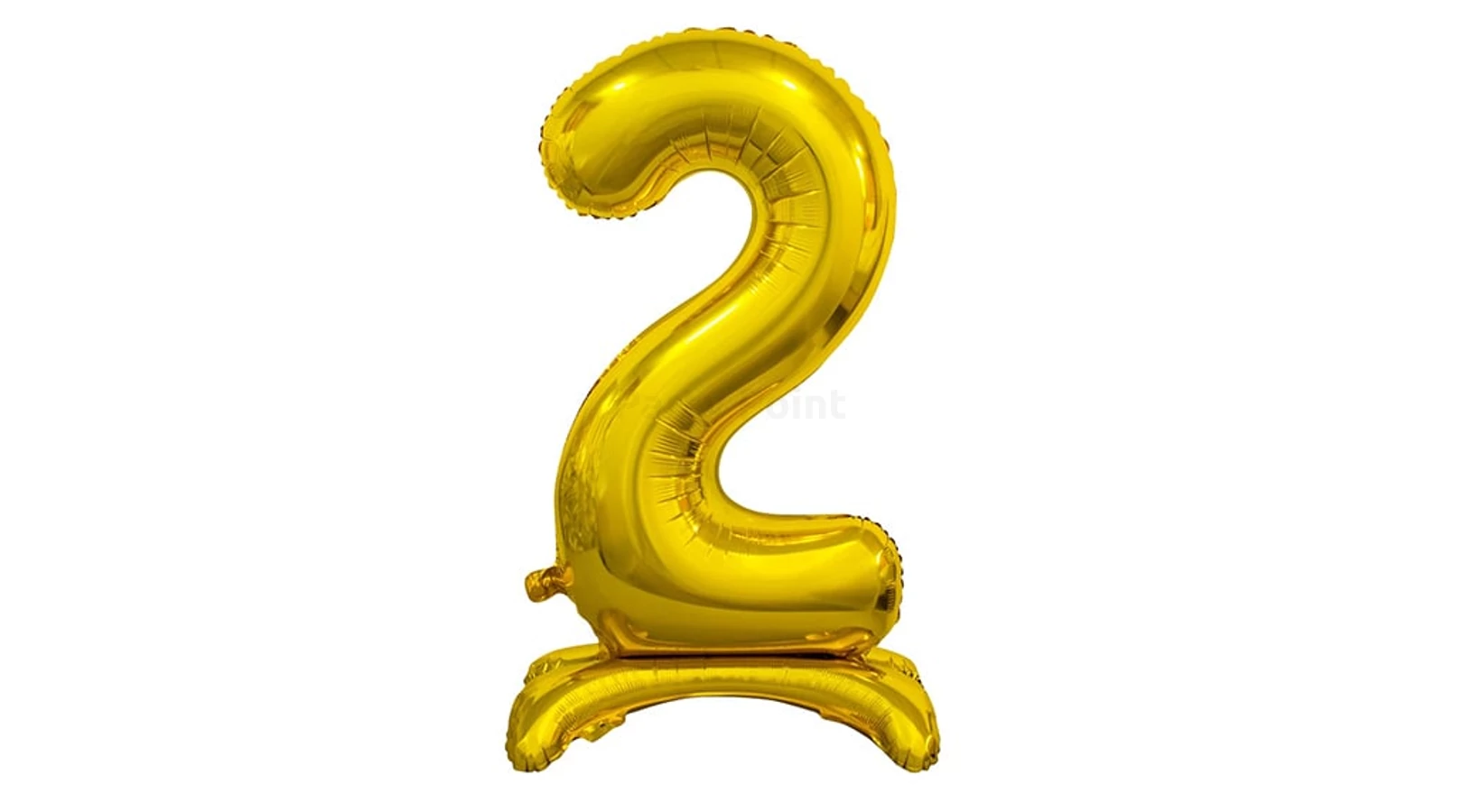 74 cm-es talpon álló arany színű 2-es szám fólia lufi. A lufi levegővel tölthető, önzáró szelepes.