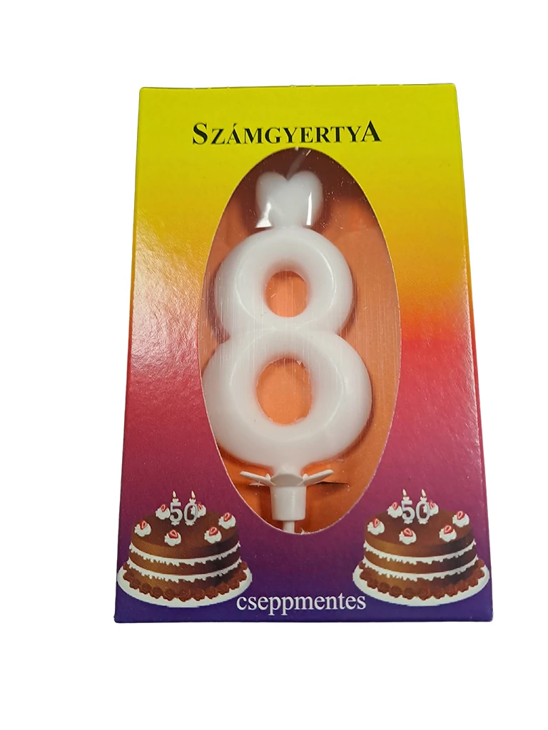 8-as fehér számgyertya - 7 cm. Díszítsd a szülinapi, vagy évfordulós tortát ezzel az elegáns, fehér színű számgyertyával. Más számgyertyákkal kombinálva, bármilyen kerek évszám kirakható. A gyertya 7 cm-es.
