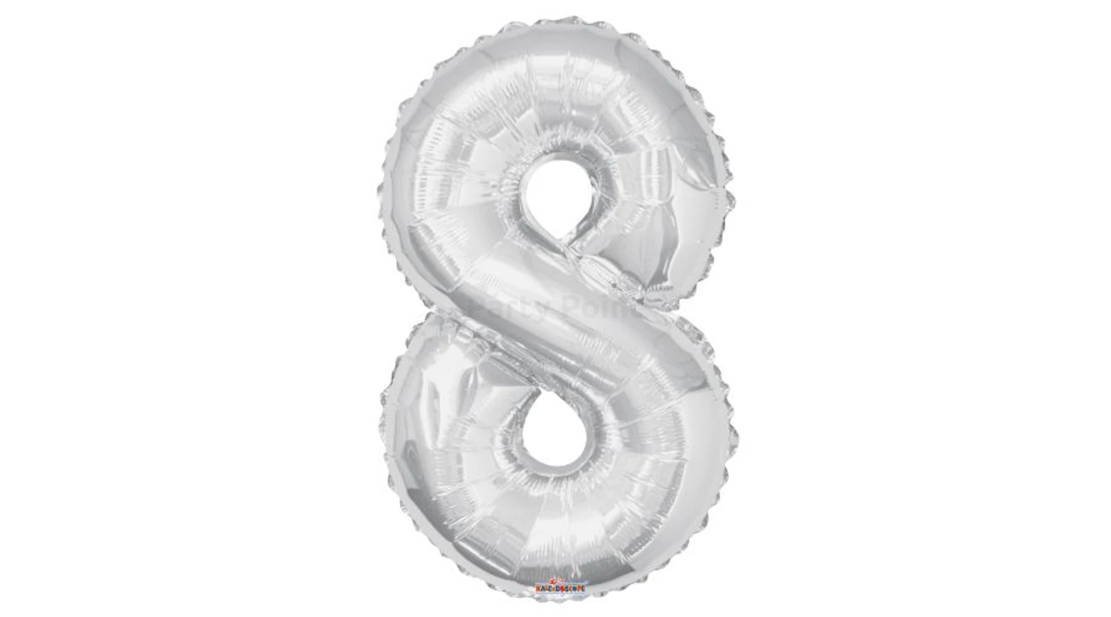 87 cm-es 8-as ezüst szám fólia lufi. Kiváló ajándék és dekoráció ez az impresszív, szám alakú lufi, elegáns, ezüst színben. Válassz mellé másik, szám alakú lufit, és rakd ki a kívánt évszámot! A dekorációt kiegészítheted alkalomhoz illő gumi lufikkal, feliratokkal vagy girlandokkal. Héliummal és levegővel is tölthető.