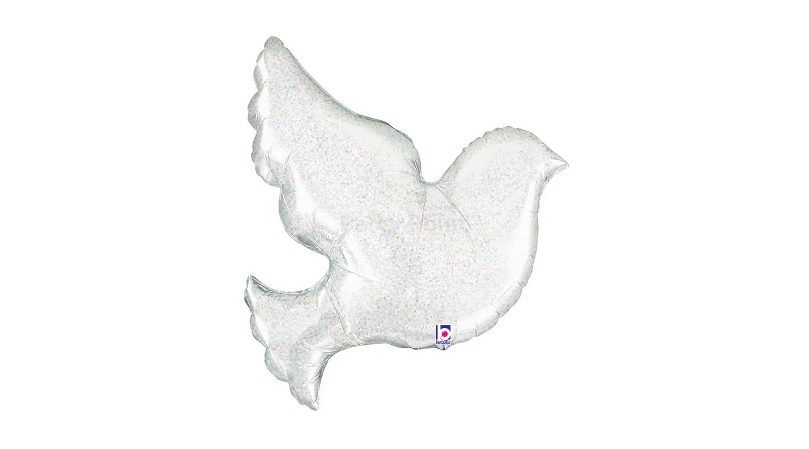 Csomagolt, 87 cm-es Galamb formájú, gyöngyház, hologrammos esküvői fólia lufi. Önzáró szeleppel rendelkezik, felfújható héliummal és levegővel egyaránt.