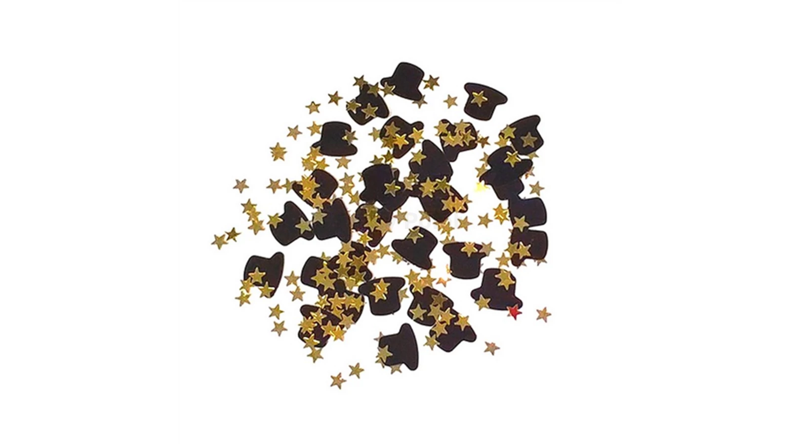 Arany csillag fekete kalapokkal konfetti, 31 g/csomag. Szilveszteri partyhoz ne hagyd ki ezt az arany csillag konfettit! Kombinálhatod különböző formájú konfettikkel.