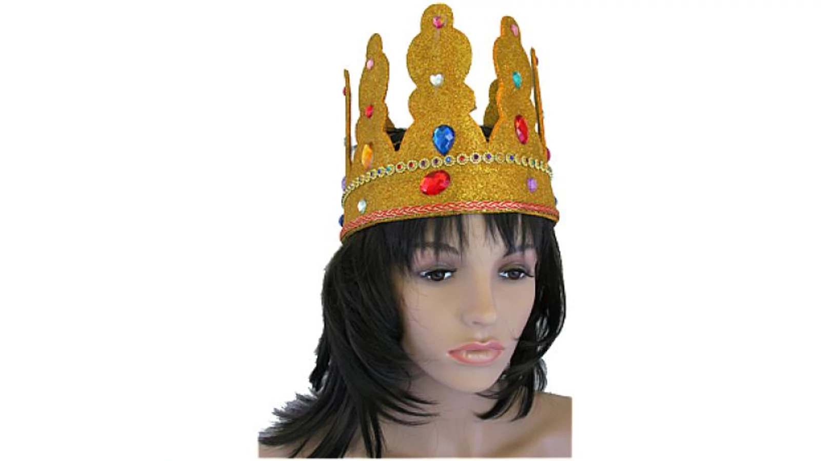 Öltözz királynak/nőnek a farsangi vagy szilveszteri bulin és egészítsd ki fejedelmi öltözékedet ezzel az arany színű, kövekkel díszített koronával!