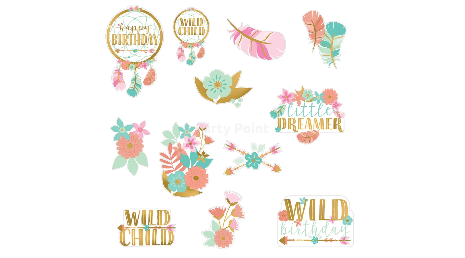 Boho Birthday Girl - Happy Birthday virágos-arany színű kivágható térdekoráció szett 12db/cs