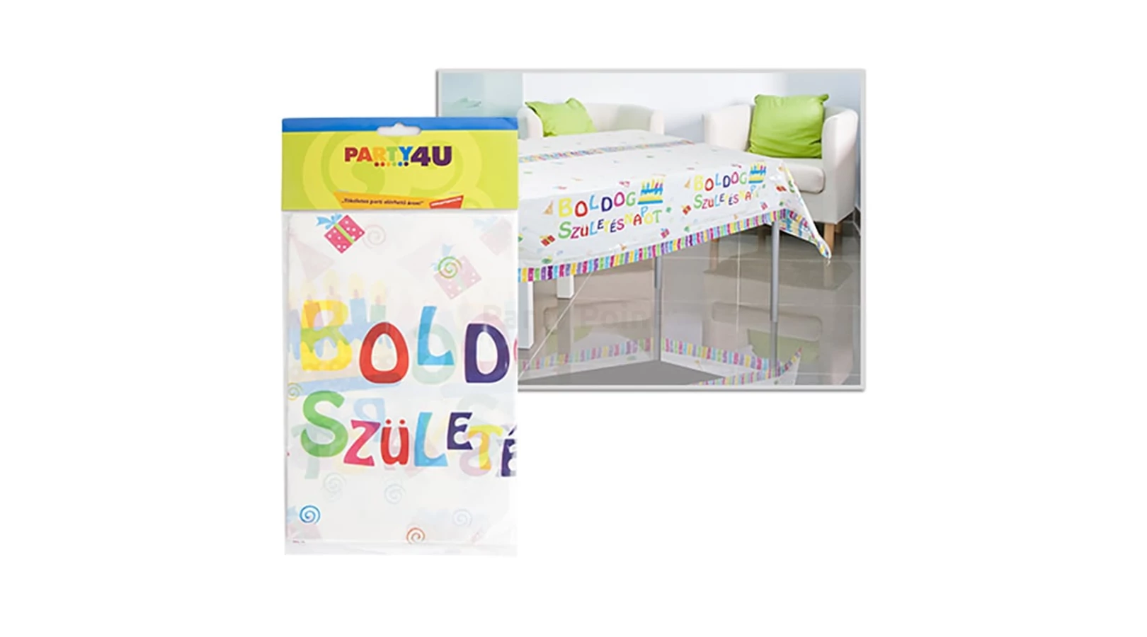 Boldog Születésnapot műanyag asztalterítő, mérete: 130 x 180 cm. Feldobnád a születésnapi party dekorációt? Válaszd ezt a vidám, "Boldog Születésnapot" feliratú asztalterítőt. A teljes összhang érdekében, egészítsd ki a terítéket, hozzá illő party tányérral, pohárral és szalvétával is.