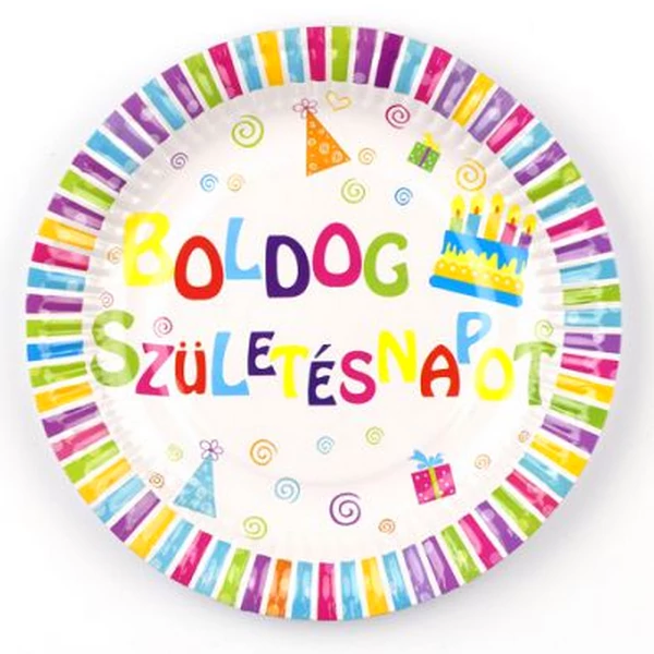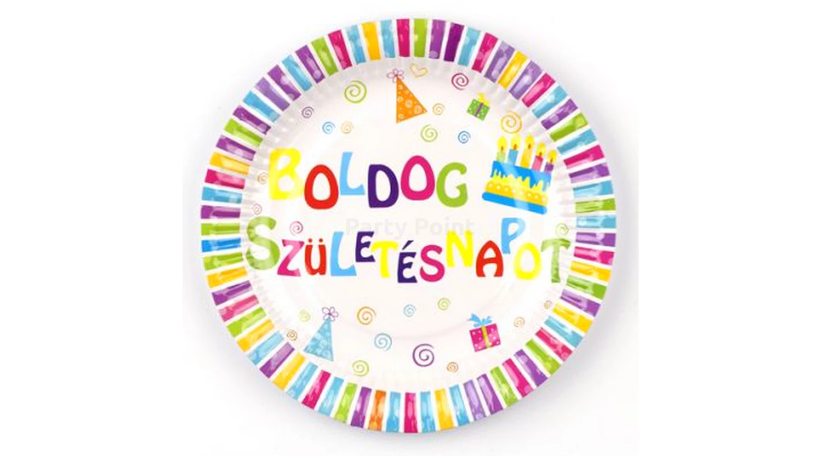 Boldog Születésnapot tányér, 23 cm. Feldobnád a születésnapi party dekorációt? Válaszd ezt a vidám, színes, "Boldog Születésnapot" feliratú tányér készletet. A teljes összhang érdekében, egészítsd ki a terítéket, hozzá illő party szalvétával, pohárral és asztalterítővel is.