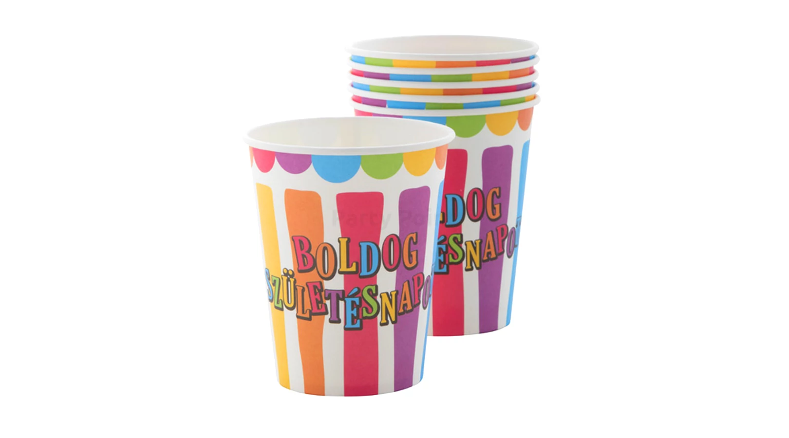 Feldobnád a születésnapi party dekorációt? Válaszd ezt a színes, pöttyös, "Boldog Születésnapot" feliratú pohár készletet. A teljes összhang érdekében, egészítsd ki a terítéket, hozzá illő party tányérral, szalvétával és asztalterítővel is.