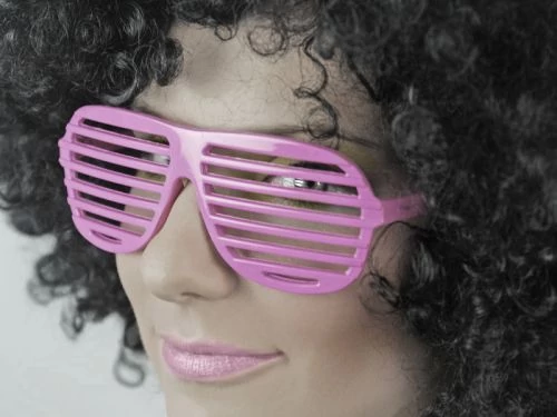 Szülinapi bulikra, zenei fesztiválokra, szilveszteri partikra ajánljuk ezt a fekete vagy rózsaszín, csíkos szemüveget, amit kiegészíthetsz hozzá illő parókával is. Anyaga: műanyag