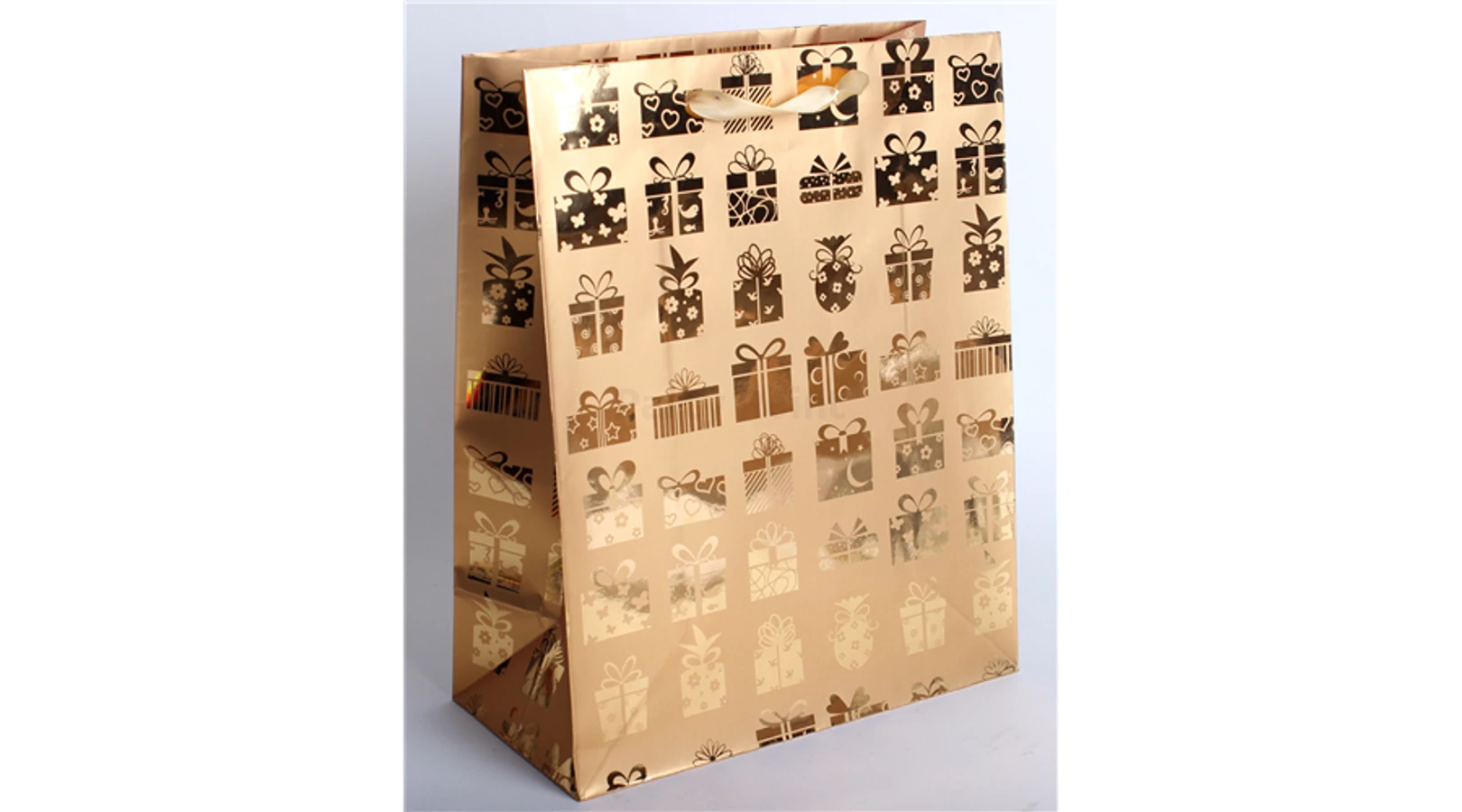 Dísztasak arany csomagok 33 x 26 cm. Rejtsd karácsonyi ajándékaidat, ebbe az ünnepi hangulatot idéző, arany, mintás dísztasakba!