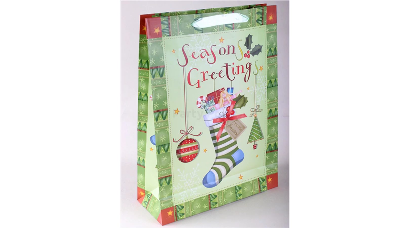 Dísztasak karácsonyi zokni mintával, Seasons Greetings felirattal