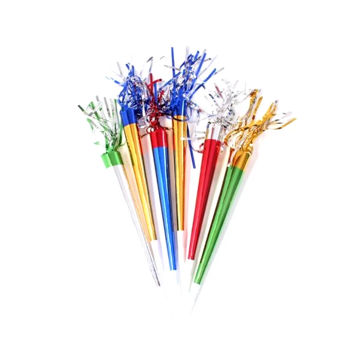 Nincs szilveszteri parti trombita nélkül! Amint éjfélt üt az óra, ünnepeld meg jó hangosan az új évet! Engedj a magasba héliumos lufikat is! A csomag 6 db rojtos, fényes fólia trombitát tartalmaz vegyes színekben. Mérete 25 cm.