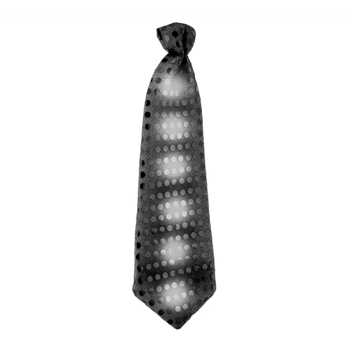 Flitterrel díszített, LED-es fekete nyakkendő, 30 cm. LED színek: zöld, kék, piros. A LED fényeket a nyakkendő hátulján található gomb segítségével lehet bekapcsolni. (A nyakkendő rugalmas pánttal rögzíthető.)