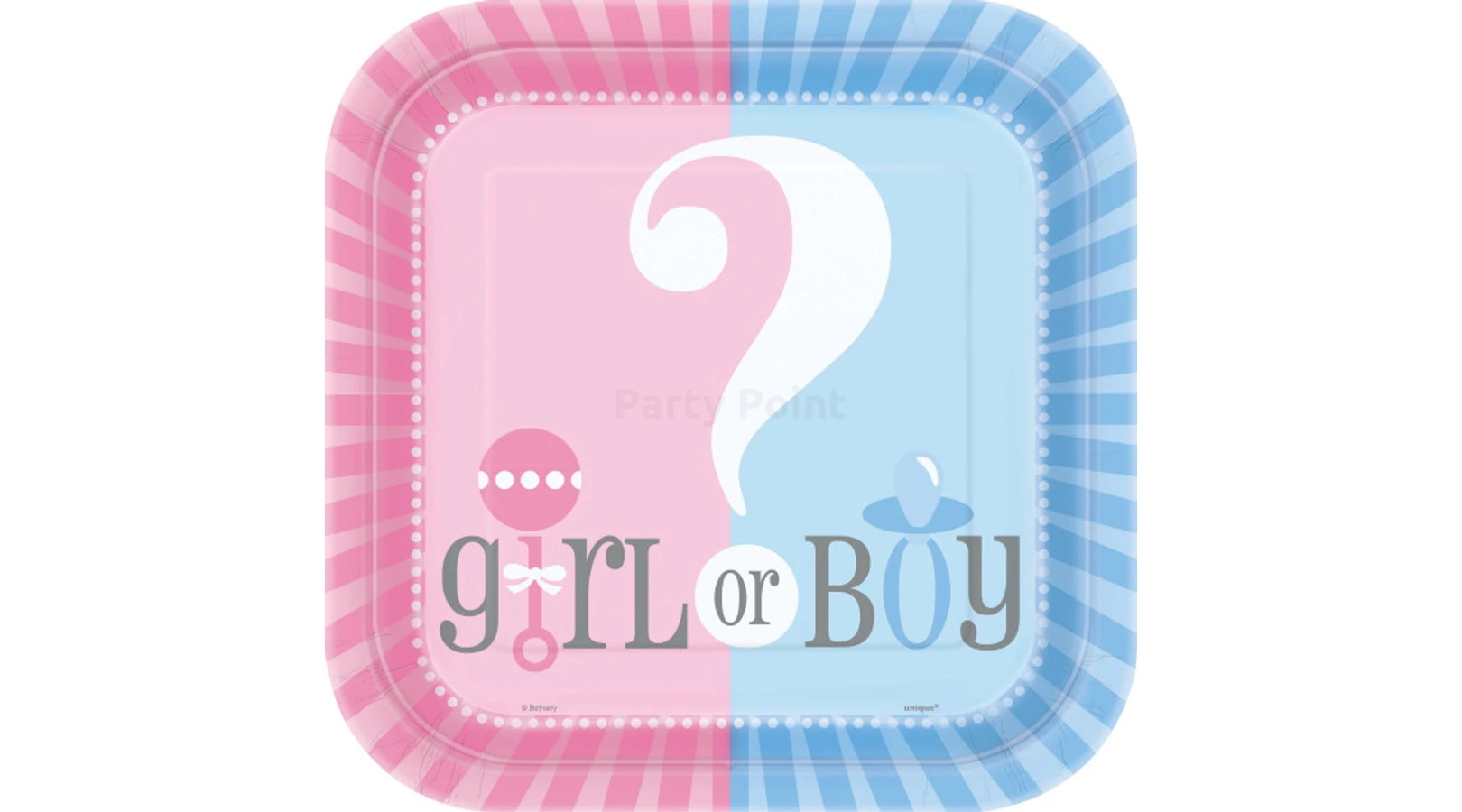A születendő gyermek nemét különleges módon szeretnéd megtudni és megünnepelni szeretteiddel? Rendezz egy baba nemét felfedő bulit ("Gender Reveal Party"), az ünnepi asztalra pedig kerüljön "girl or boy" feliratos tányér, amit kiegészíthetsz hozzáillő pohárral, szalvétával, netalán fólia lufival. A tányérok mérete: 23 cm. A csomag tartalma: 8db papírtányér.