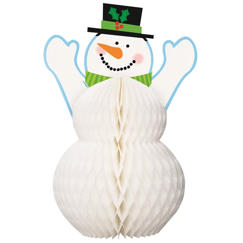 Hóember méhsejt dekoráció 30cm. Öltöztesd lakásodat, irodádat, üzletedet ünnepi hangulatba! Függeszd fel ezt a dekorációt az ablakra, ajtóra, vagy akár a plafonra és egészítsd ki girlandokkal és hozzá illő anyagokkal is.