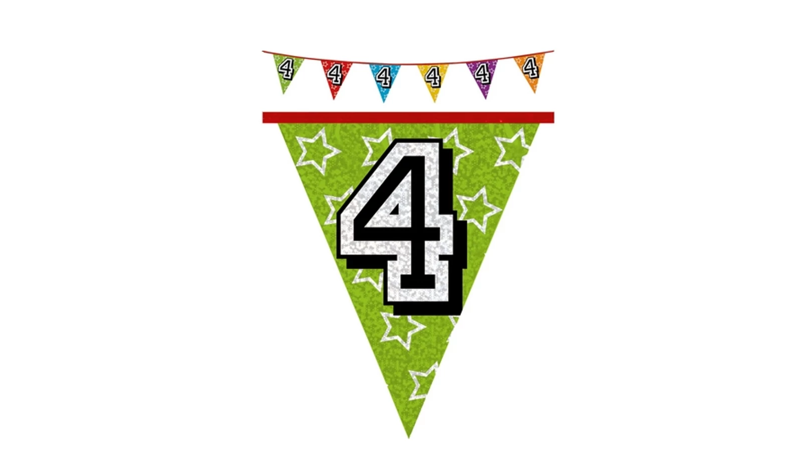Hologramos zászló 4. születésnapra, 8 m 16 zászlóval. Egyetlen igazán nagyszerű születésnapi buliból se maradhat ki a vidám, ünnepi dekoráció. Válaszd ezt a színes, hologramos, számozott zászlót a party helyszín feldíszítéséhez! Kiegészíthető hozzá illő gumilufikkal, fólia léggömbökkel és szülinapi feliratokkal.