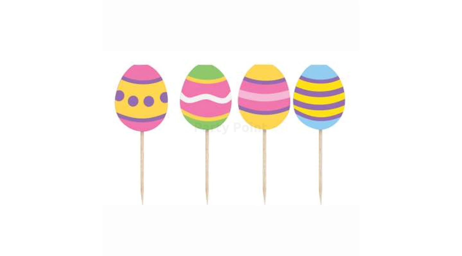 Készíts a vendégek számára húsvéti falatkákat és díszítsd mindegyiket egy-egy húsvéti tojásos pálcikával.