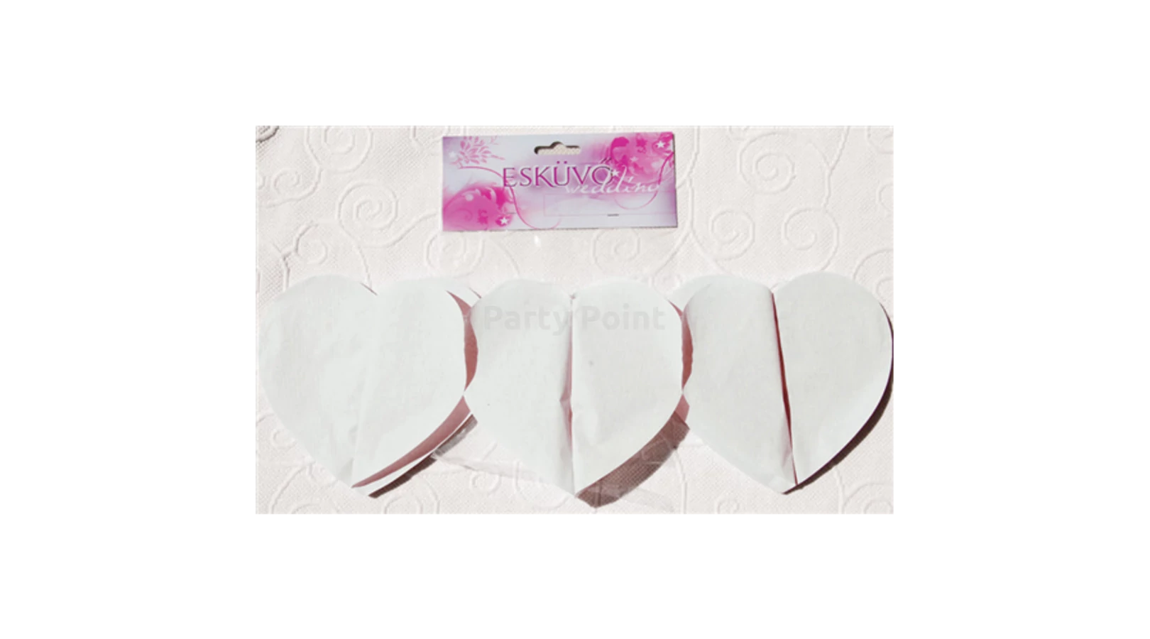 Esküvői és Valentín napi rendezvények romantikus díszítő eleme lehet ez a szép, irovy színű, szív formájú papír girland. A díszítés kiegészíthető fólia- és gumi léggömbökkel, anyagokkal, szalagokkal is. Mérete: 400x17x17cm.