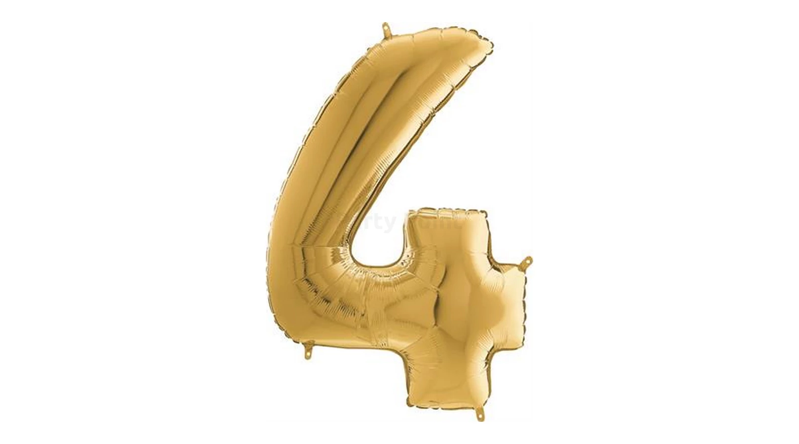 Csomagolt, 65 cm-es arany 4-es szám fólia lufi. A lufi héliummal és levegővel tölthető, önzáró szelepes.