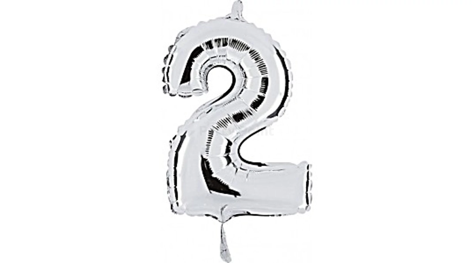 Csomagolt, 65 cm-es ezüst 2-es szám fólia lufi. A lufi héliummal és levegővel tölthető, önzáró szelepes.
