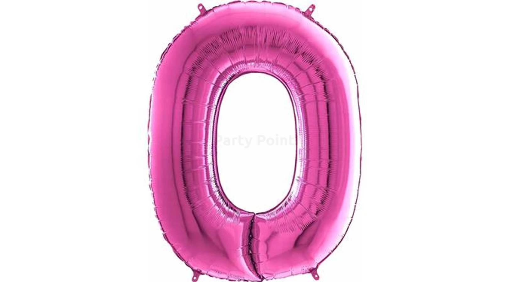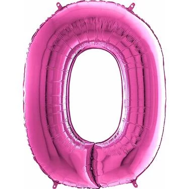 Csomagolt, 65 cm-es fuxia 0-ás szám fólia lufi. A lufi héliummal és levegővel tölthető, önzáró szelepes.
