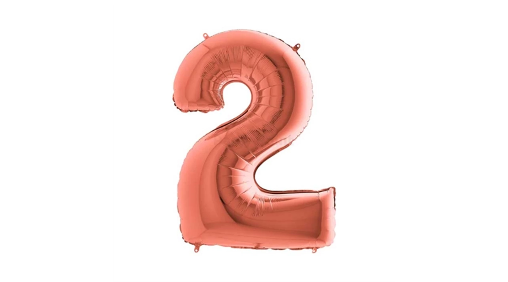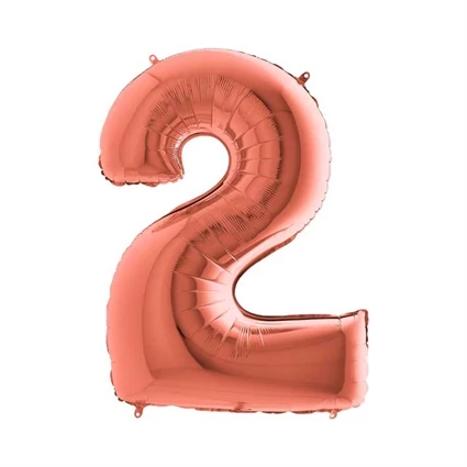 Csomagolt, 65 cm-es rosegold 2-es szám fólia lufi. A lufi héliummal és levegővel tölthető, önzáró szelepes.
