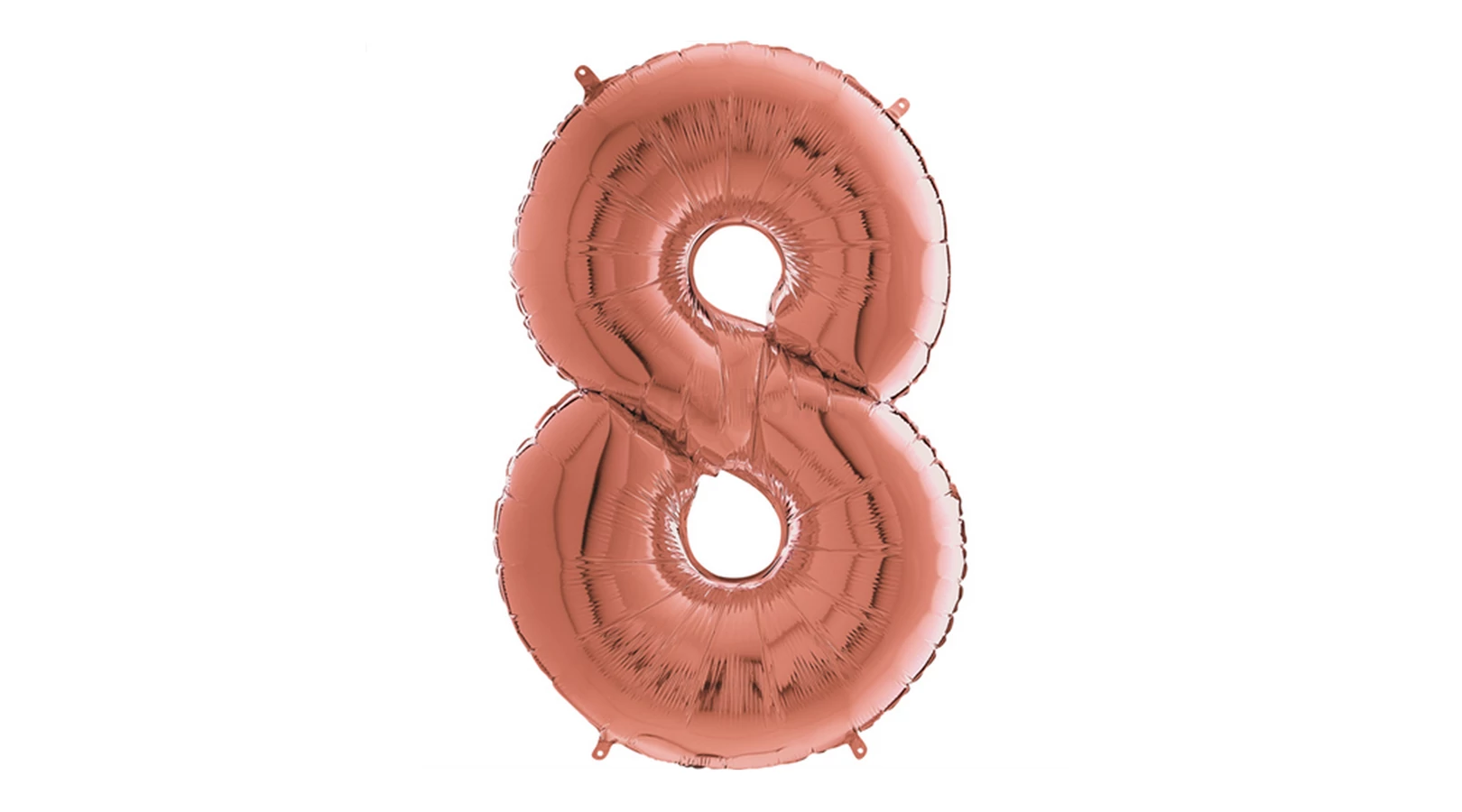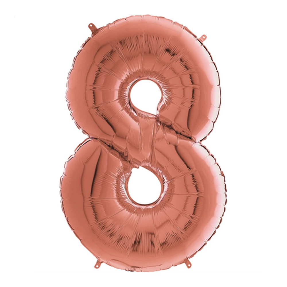 Csomagolt, 65 cm-es rosegold 8-as fólia lufi. A lufi héliummal és levegővel tölthető, önzáró szelepes.