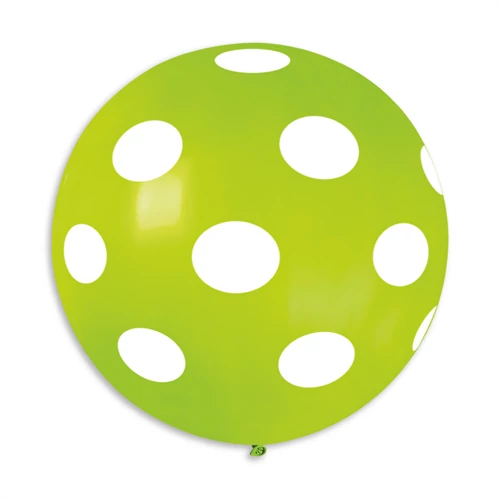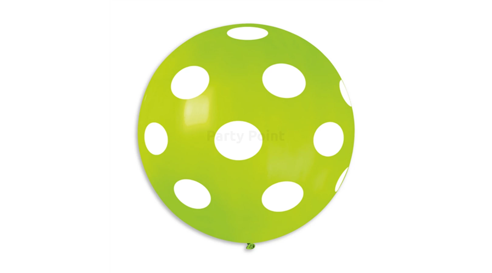 80 cm-es fehér pöttyös lime zöld gumi lufi. Ezzel a vidám, pöttyös mintával feldobhatsz bármilyen léggömbdekorációt, legyen szó "baby shower"-ről, születésnapi partyról vagy esetleg esküvőről. Kiegészítő színként válassz mellé egyszínű fehér, lime zöld vagy más pöttyös mintájú gumi lufit. Héliummal és levegővel is tölthető.