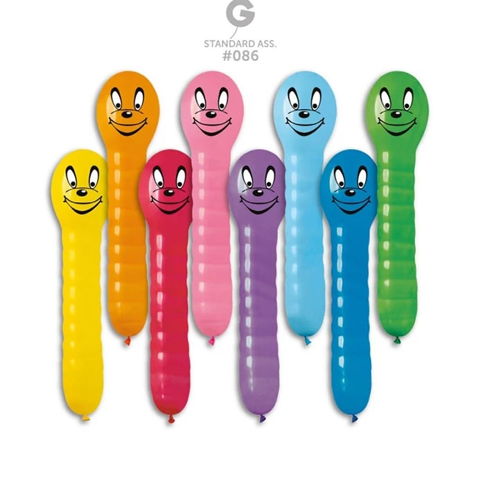 Születésnapi partik, majálisok, farsangi-, gyereknapi, rendezvények kedvelt figurája lehet ez a kb. 1 méter magas, füles hernyó formájú gumilufi, mely párosítható állatkás fólia léggömbbel is. Minimum rendelési egység: 50 db/csomag.